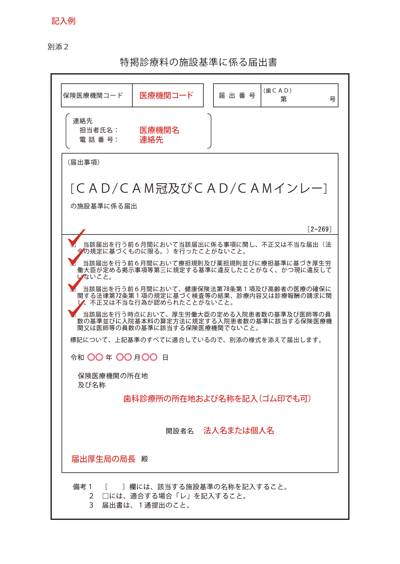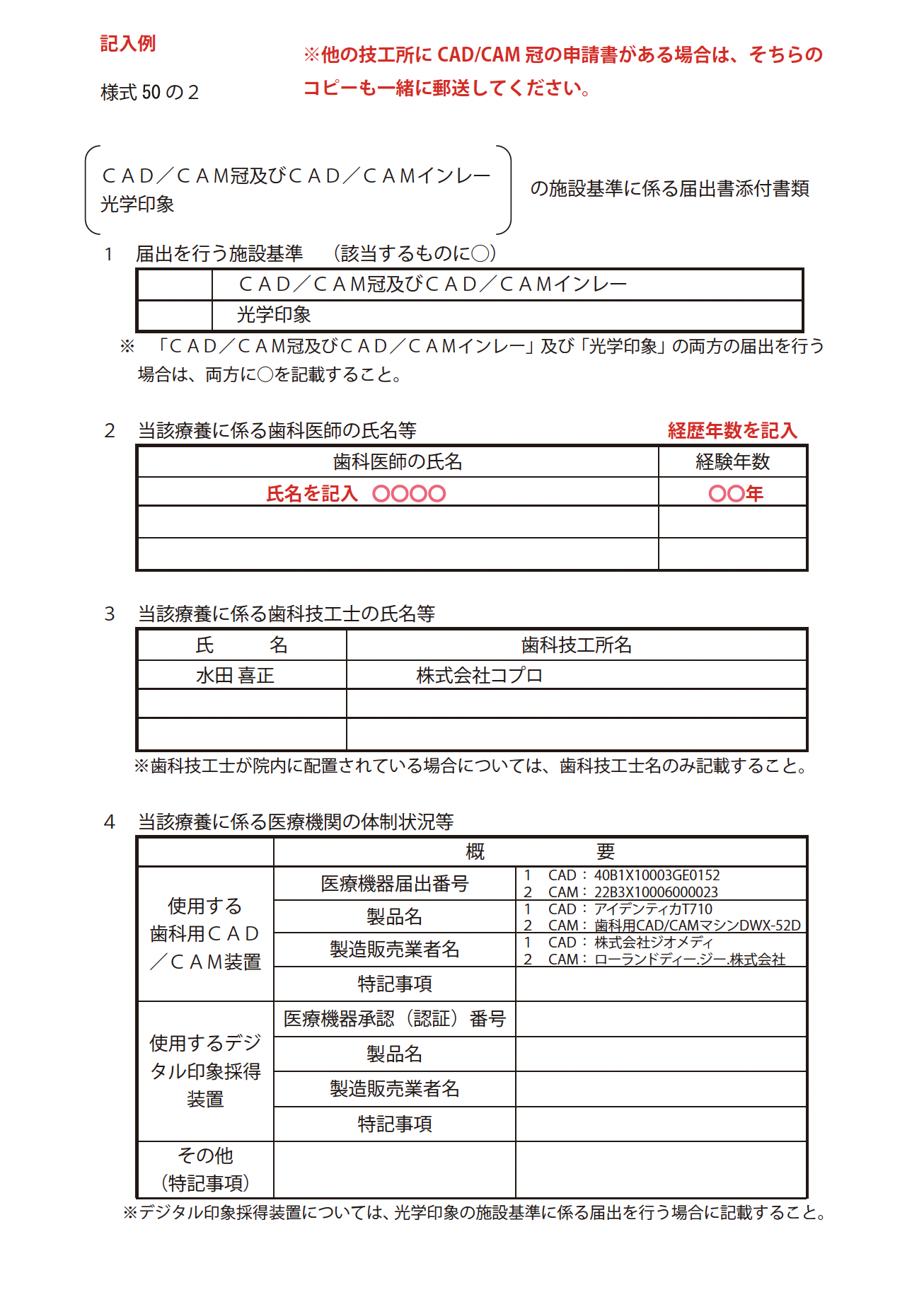 CAD冠申請用紙 株式会社コプロの記載済みテンプレートになります。 ・様式 50の2 (施設基準に係る届出書添付書) ・特掲診療料の施設基準に係る届出書(CAD CAM冠及びCAD CAMインレーの施設基準に係る届出) ・特掲診療料の施設基準に係る届出書(光学印象の施設基準に係る届出) 納期 技工指示書